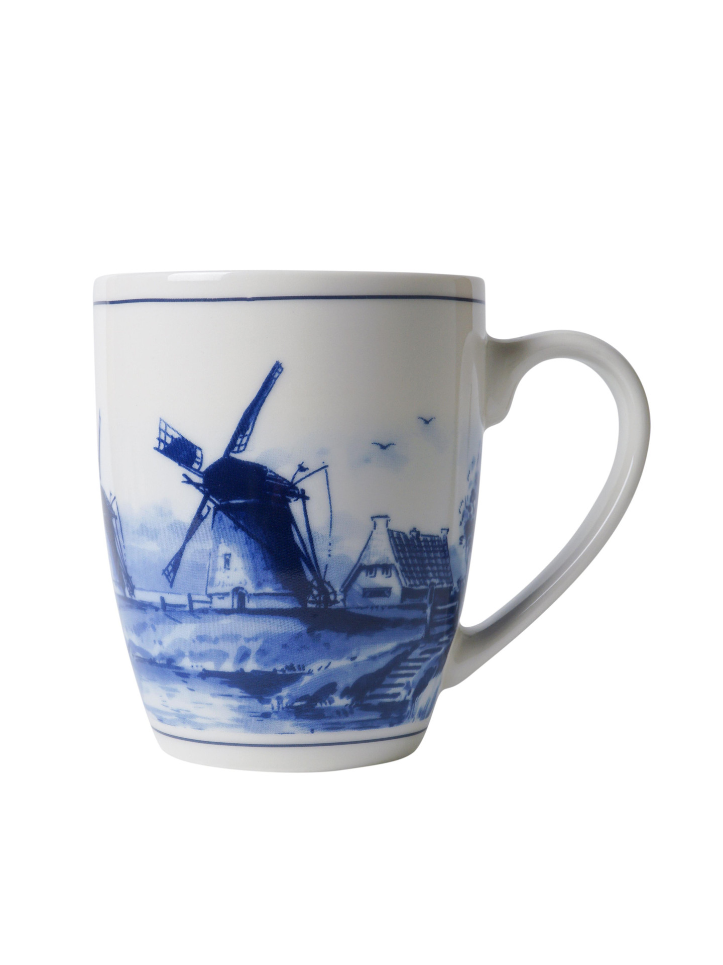 This charming mug features a typical kissing couple. A farmer and his wife secretly stealing a kiss. The epitome of a charming Delft blue mug! The elegant gold handle gives the mug a beautiful, modern look. The Delft blue mug collection includes many different images, and each handle is slightly different, making it even more fun to mix and match different mugs.