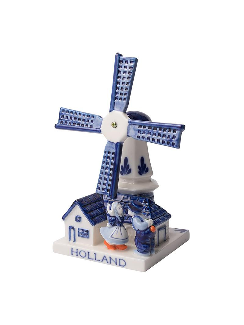One of the world's most famous kissing couples, the Delft Blue Kissing Couple! It makes a lovely wedding gift. This kissing couple has a unique shape, designed by Heinen Delft Blue. It features unique orange clogs and a charming orange tulip. The base reads "Kisses from..." on one side and "Holland" on the other.